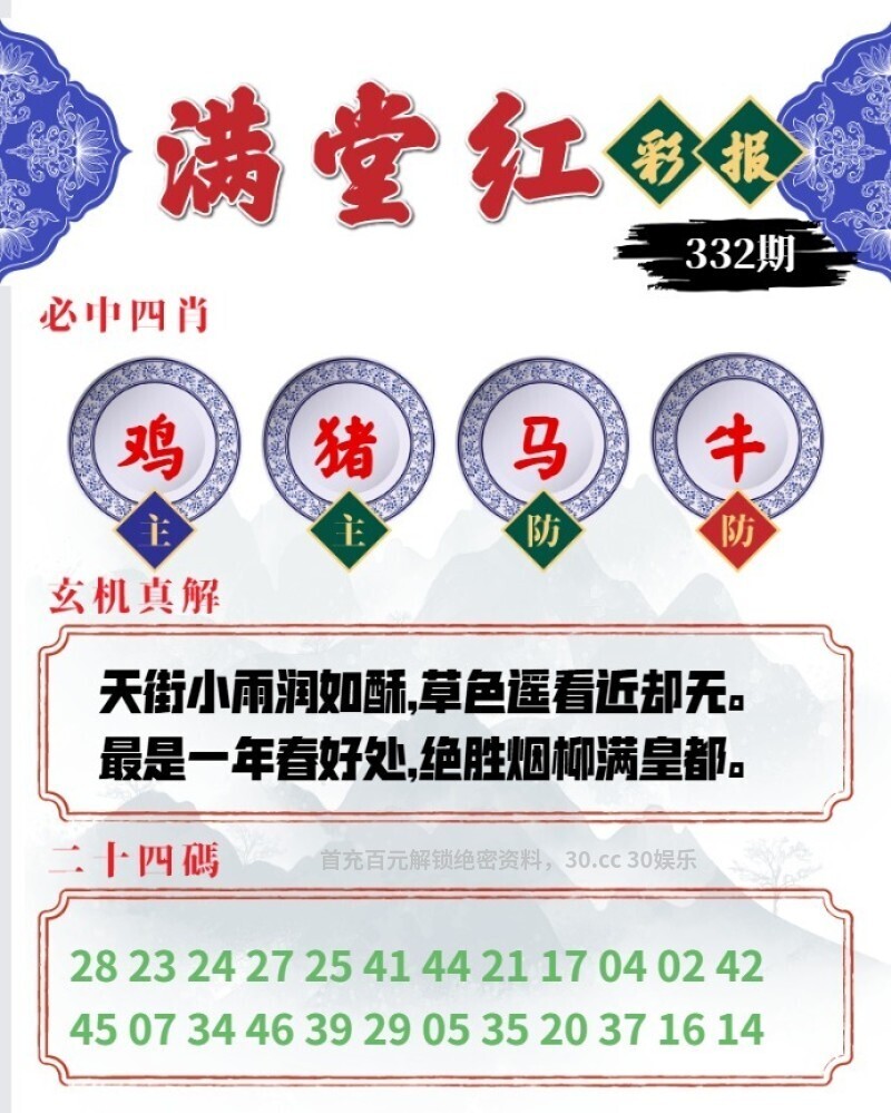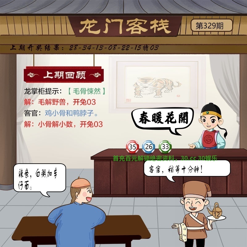 333期:龙门客栈解析 掌柜:山色返青 小二:客官,有的 客官:最近感冒了,来点清淡的粥 解:山色返青。解蛇马鼠羊鸡猴 推荐特肖:蛇马鼠羊鸡猴 |