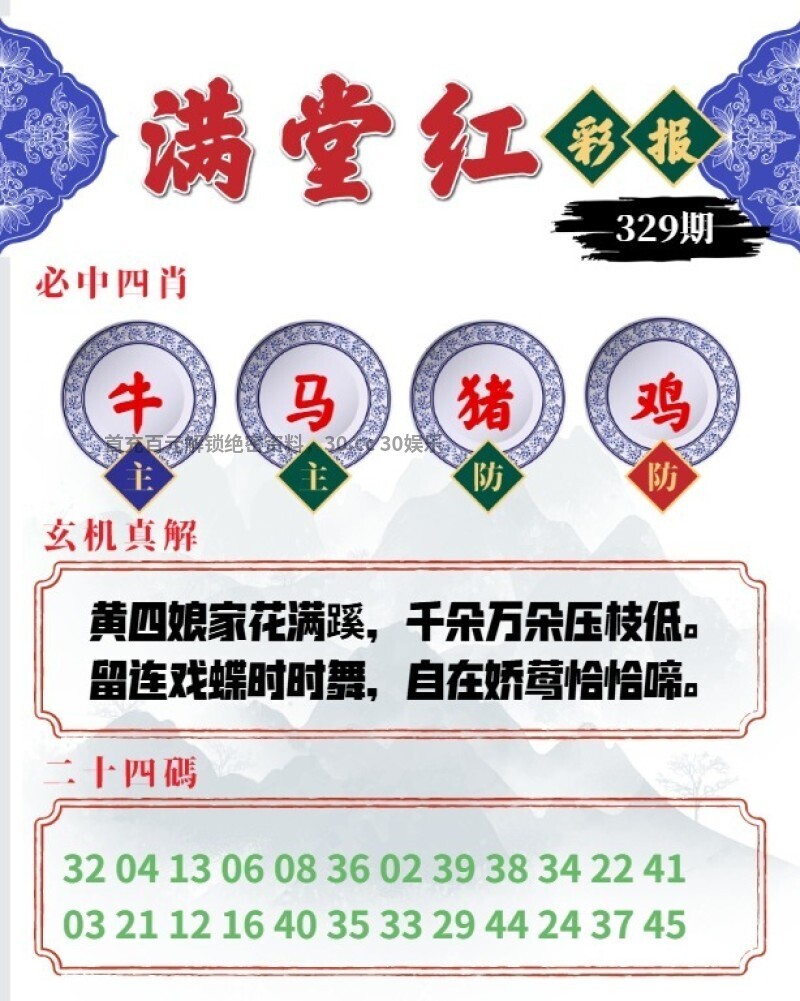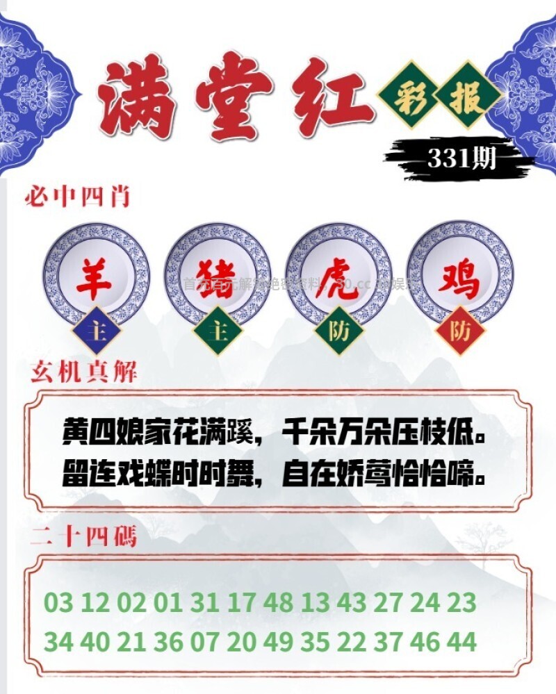 331期满堂红彩报:黄四娘家花满蹊,千朵万朵压枝低。留连戏蝶时时舞,自在娇莺恰恰啼。 六肖:猴鸡龙狗虎蛇 三肖:猴鸡龙 特码:34.46.21.33.14.26.08.20.04.28.13.37 |