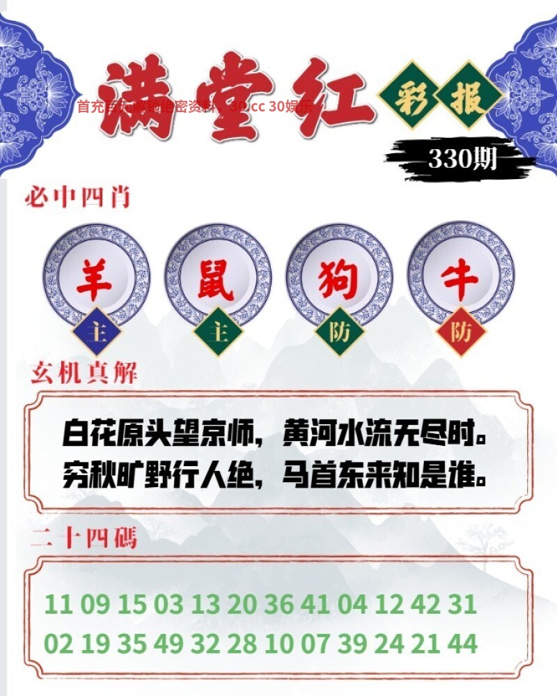 330期满堂红彩报:白花原头望京师,黄河水流无尽时。穷秋旷野行人绝,马首东来知是谁。 六肖:狗牛猴龙马鼠 |